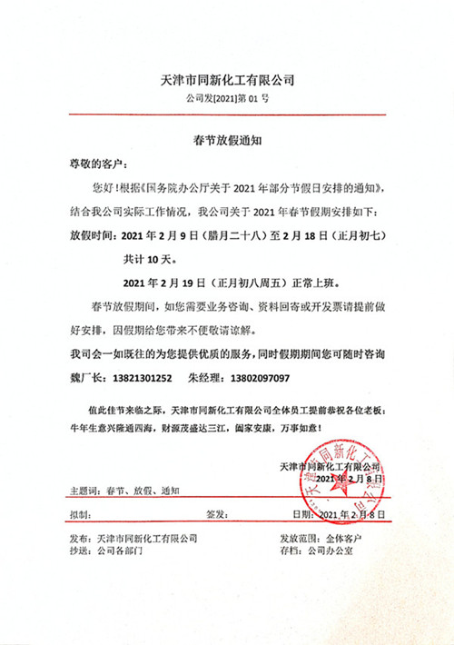 天津市同新化工有限公司春節放假通知!